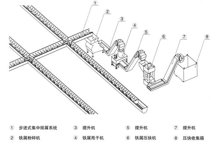 步進(jìn)式排屑機(jī)的組合型式:步進(jìn)排屑機(jī)常與鏈板排屑機(jī)搭配使用,鏈板排屑機(jī)為支線,短距離排屑,步進(jìn)排屑機(jī)為主線,長距離輸送,是一對黃金搭檔。